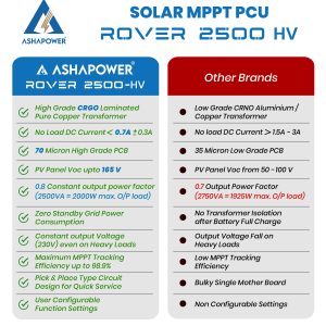 Ashapower Rover 3000 Solar PCU 36V/3KVA/60AMP. It is a powerful budget friendly solar energy extractor for home/office for iron box, rice cooker, computers, washing machine, refrigerator, laser printer, 1.5 ton 5 Star Inverter AC and a 1 HP induction motor pump when used with 2500 watts solar PV panels and 36V/200Ah batteries.