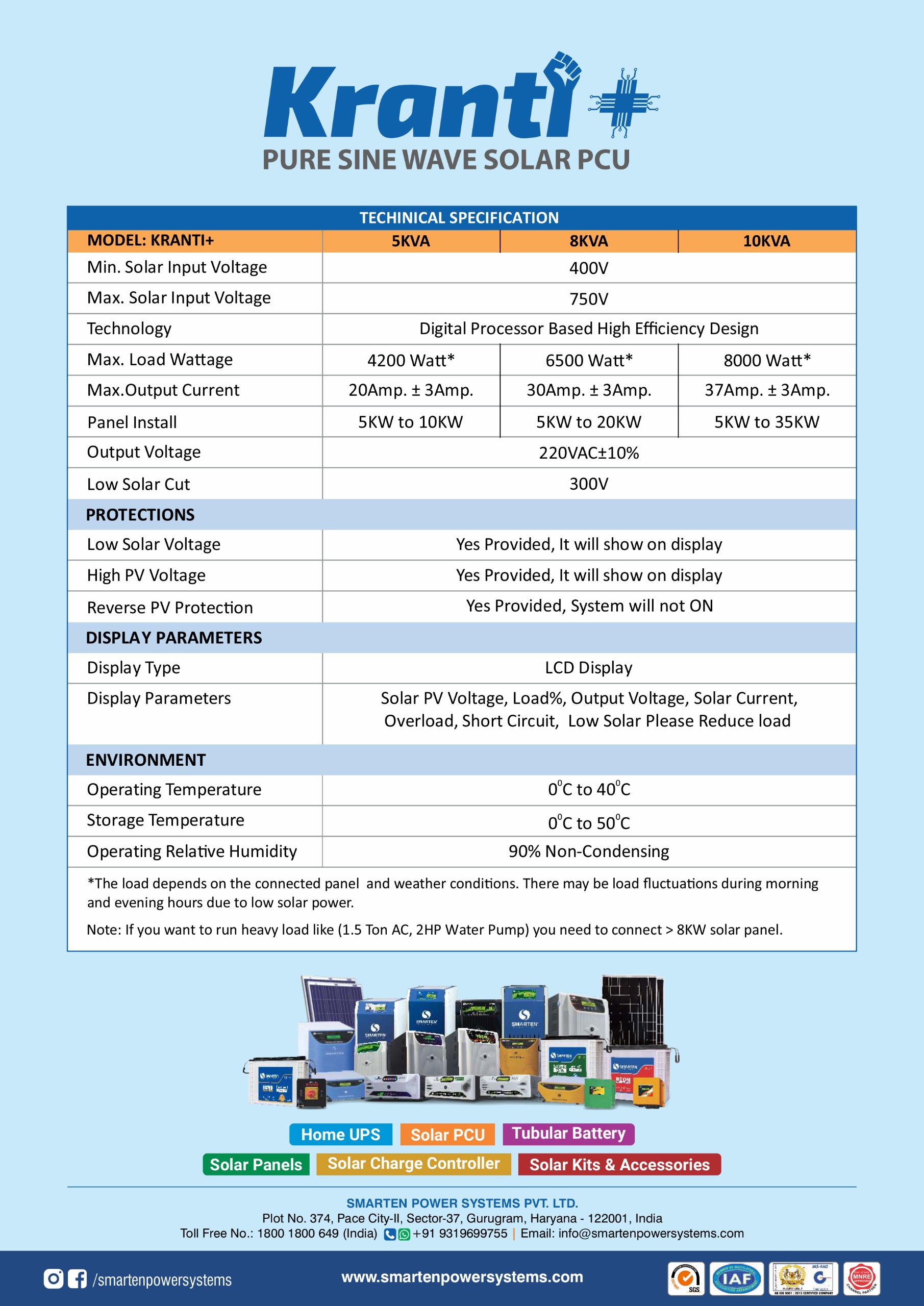 Be the first to review “Smarten Kranti+ 5KVA Battery Less MPPT Solar PCU” Cancel reply