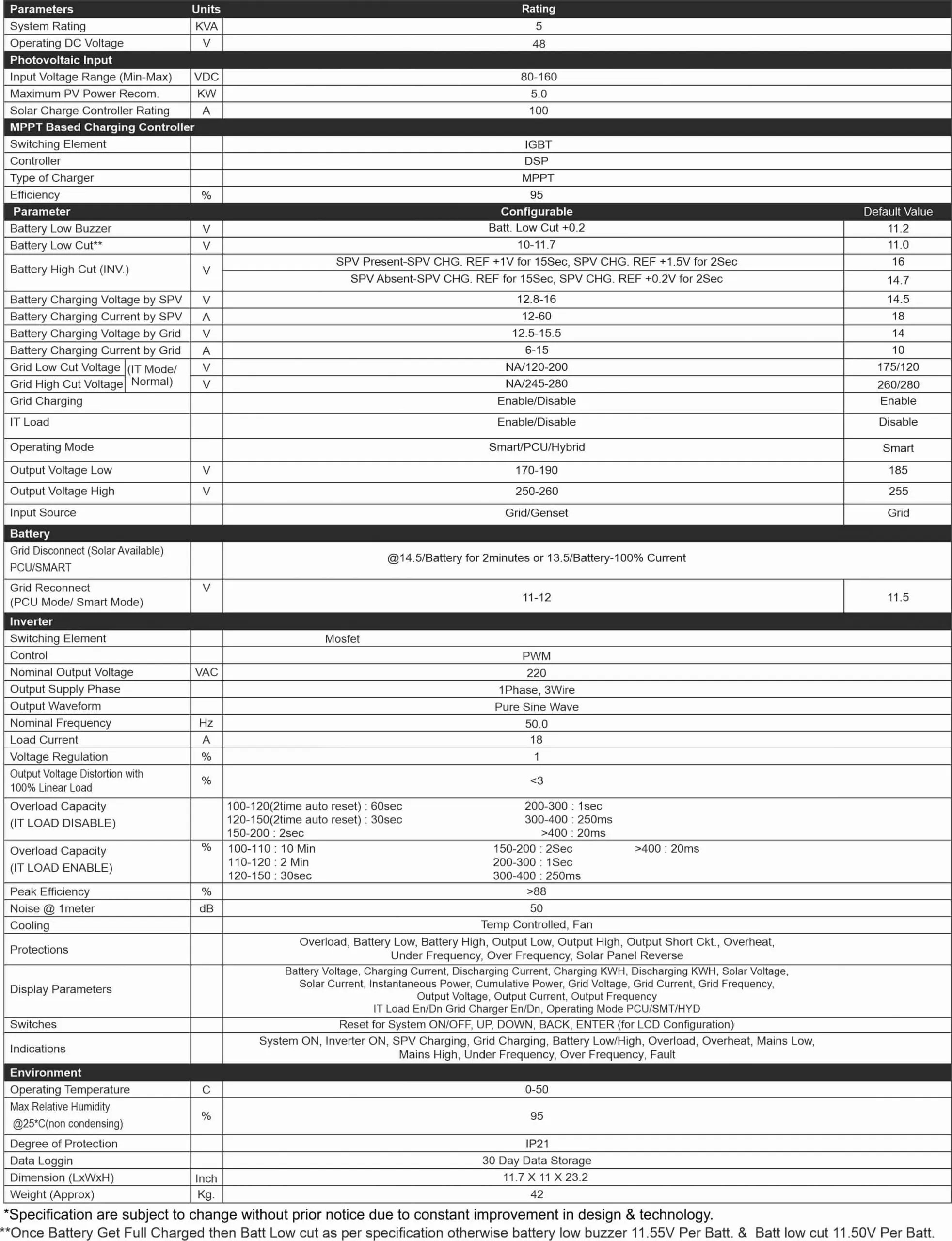 - User Friendly Control :- Output Voltage, Chg. Voltage – SPV/Grid, Chg. Current – SPV/Grid, Grid Reconnect, Batt. Low.